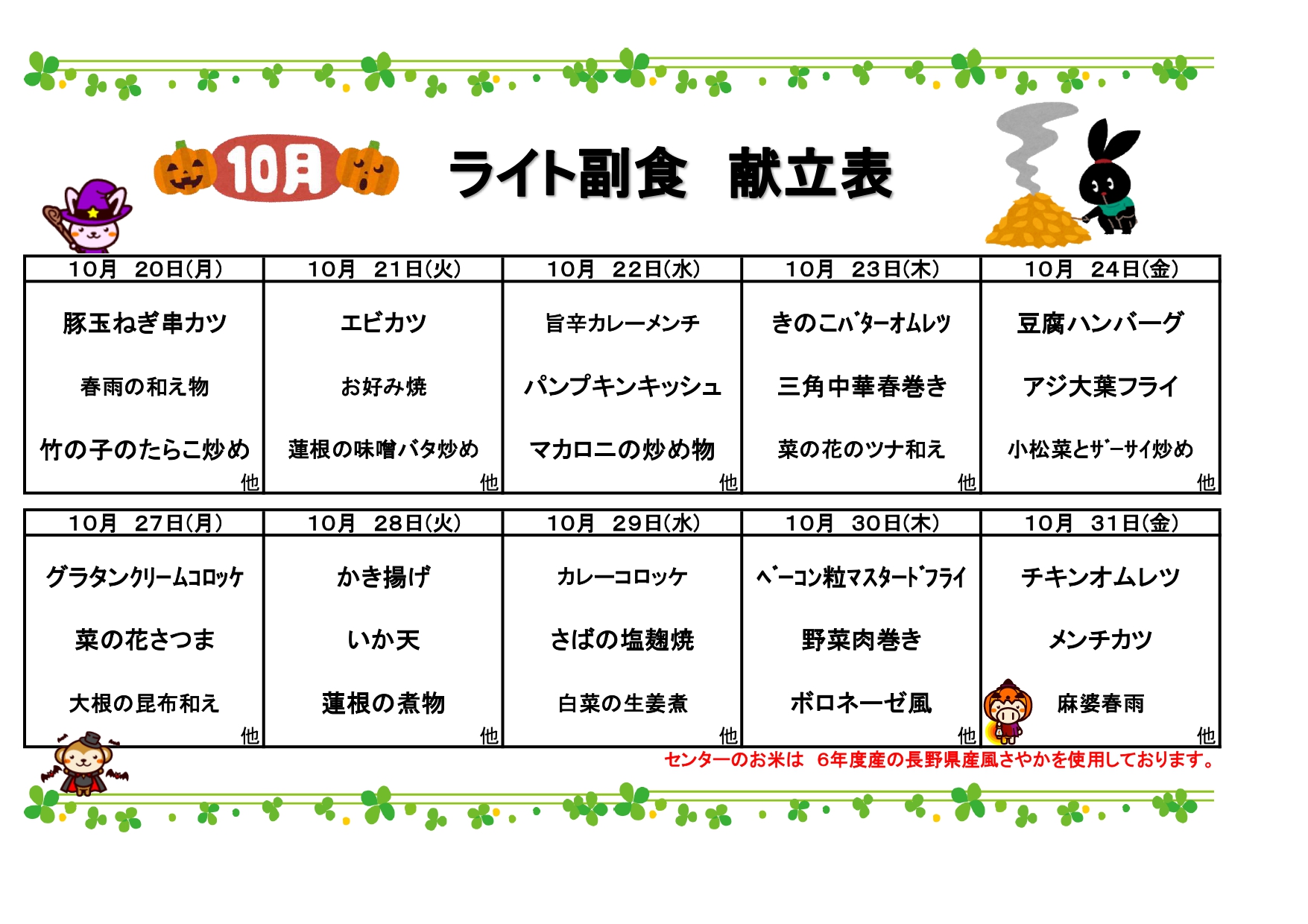 ・【ライト副食献立表】10月20日(月)~10月31日(金)